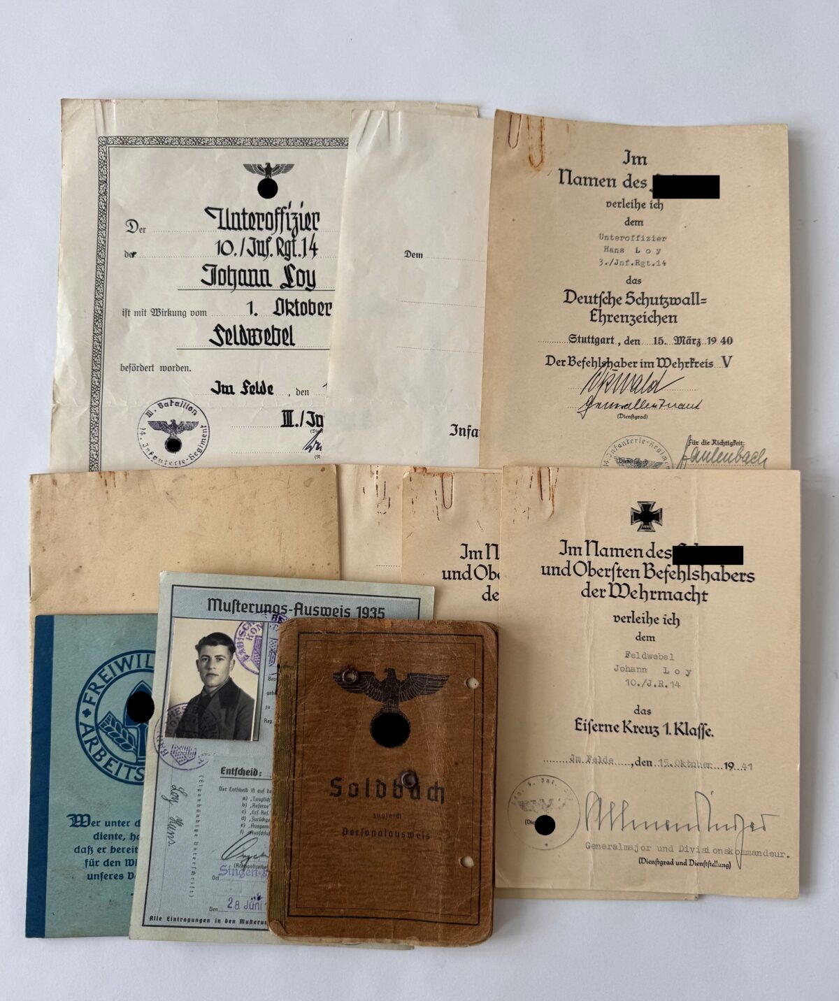Urkunden und Dokumente des Feldwebels Hans Loy. Er diente im Infanterie Regiment 14. Der Nachlass besteht aus: