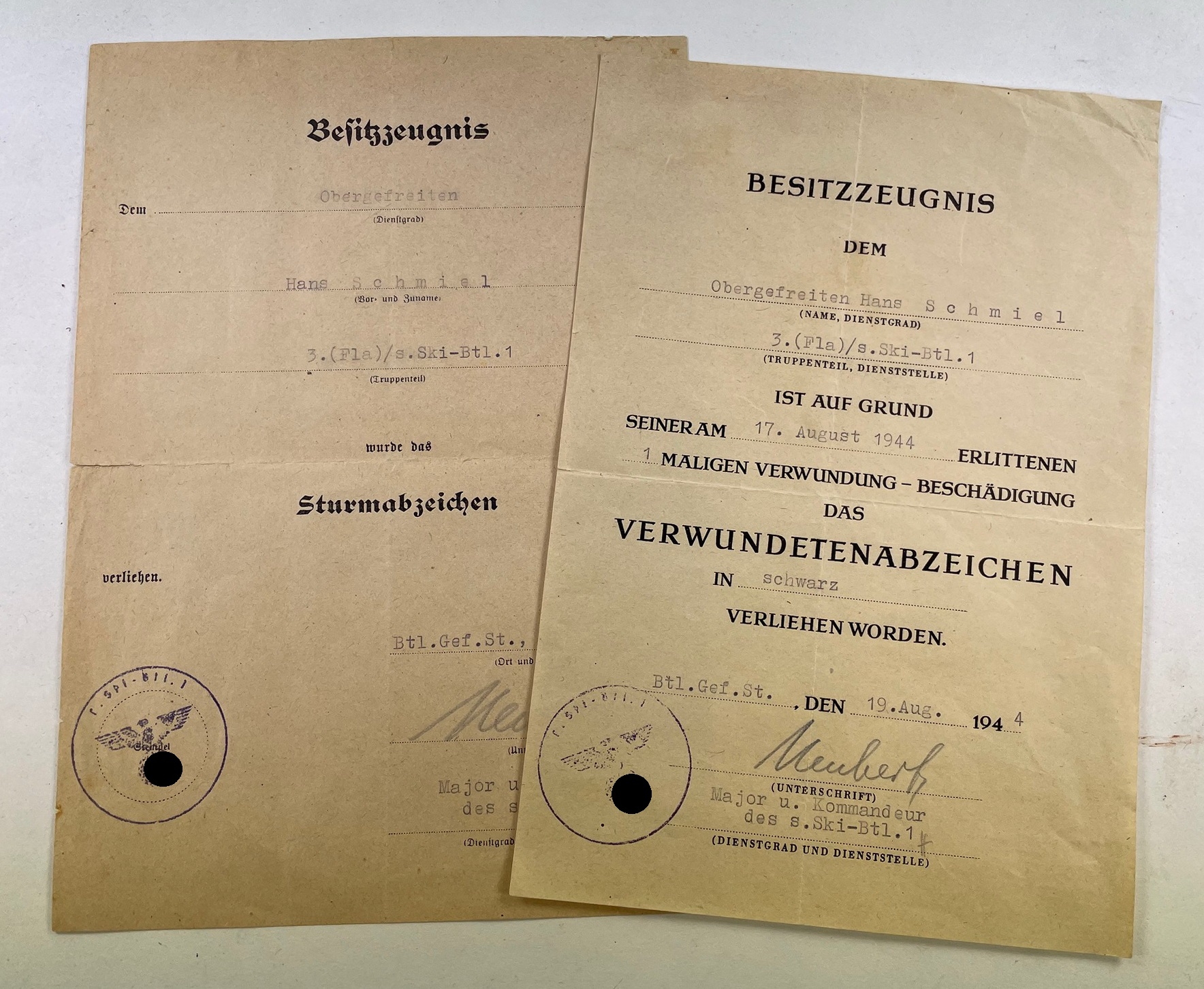 Urkunden des Obergefreiten Hans Schmiel. Der Obergefreite diente im SKI-Bataillon 1. Alle Urkunden in einen sehr guten, nur leicht gebrauchten Zustand.