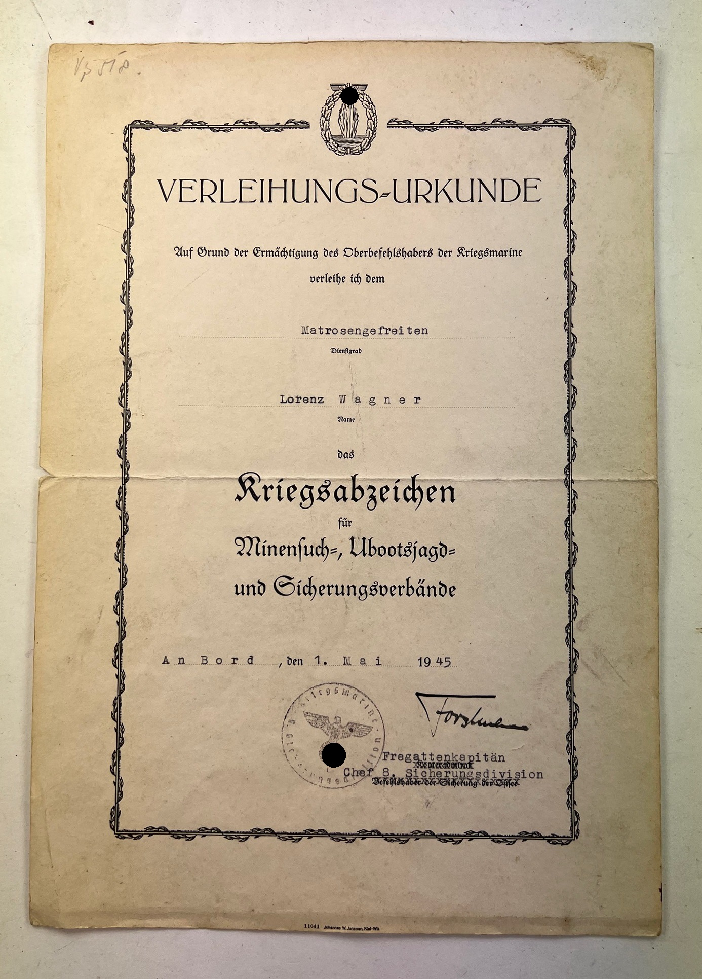 Verleihungs-Urkunde Kriegsabzeichen Minensuch-, U-Bootsjagd- und Sicherungsverbänden