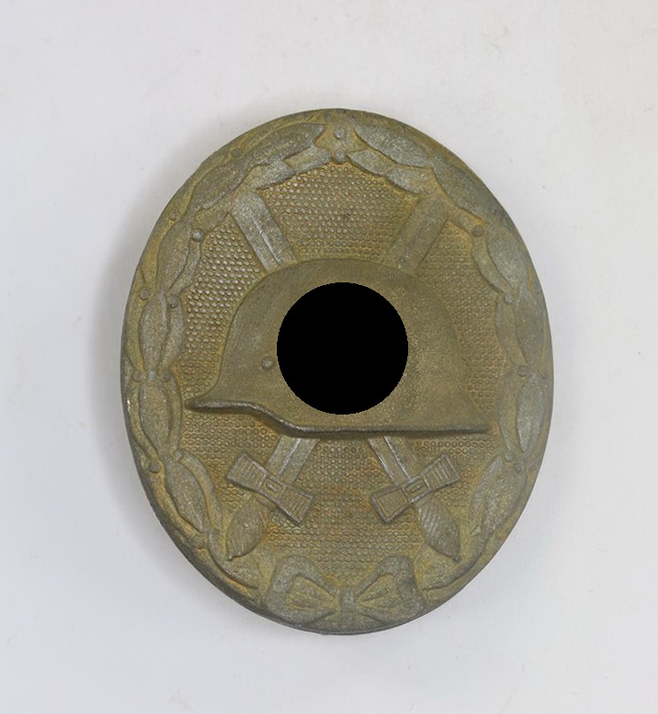 Zink, sehr guter, leicht getragen. Die Vergoldung fast vollständig vergangen. Rückseitig rechts, oberhalb des Nadelhakens die Hersteller Markierung „L/13“ für die Firma Paul Meybauer aus Berlin.
