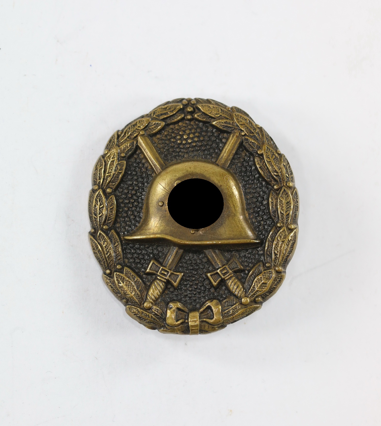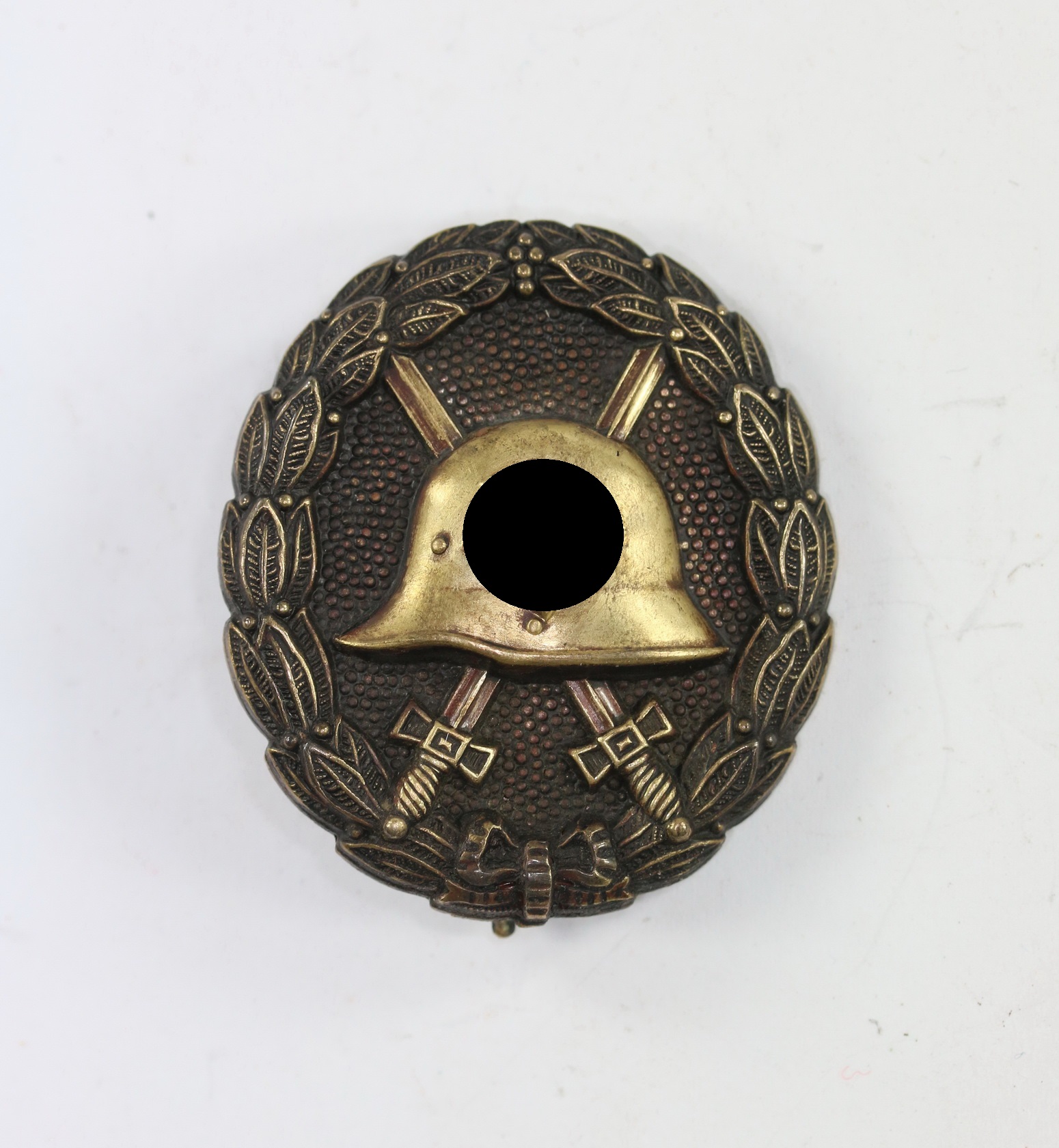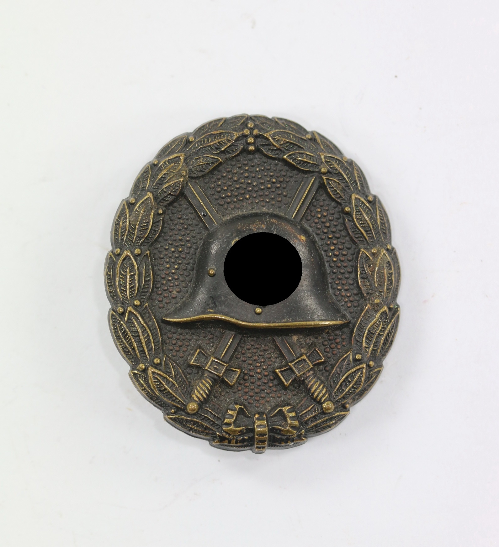 Buntmetall, sehr guter, leicht getragener Zustand. Helm und Schwertern vom Träger von der Farbe befreit, sonst mit noch sehr schöner Schwärzung. Ohne Hersteller, aber eine bekannte Variante.