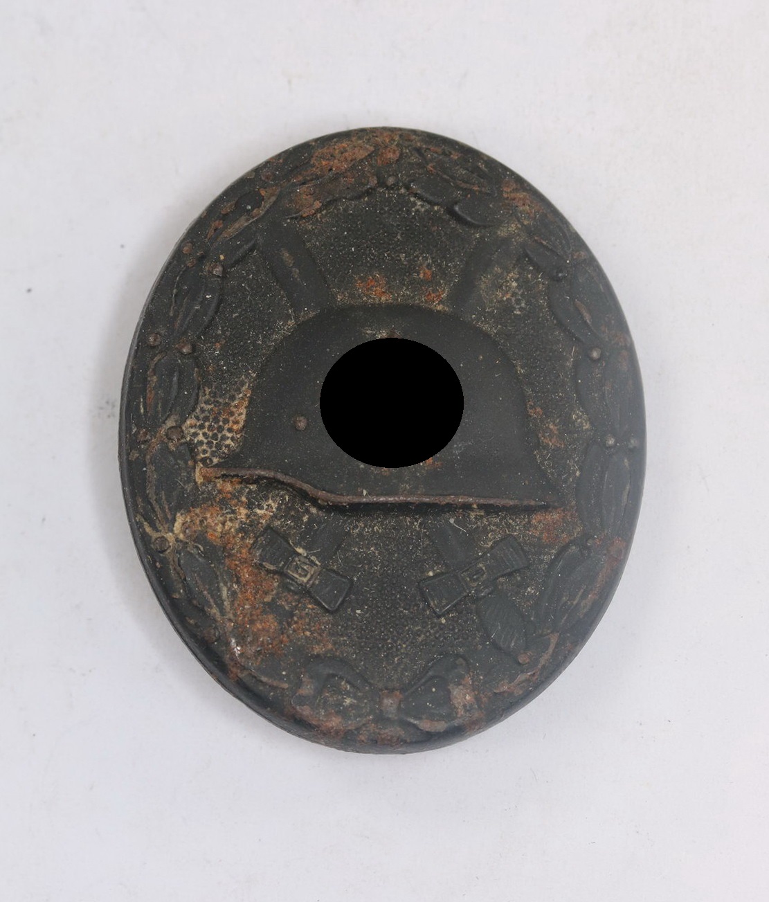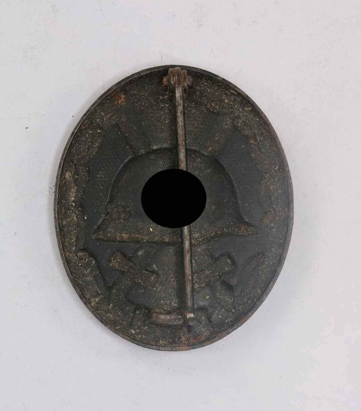Das Verwundetenabzeichen hohl geprägt aus Eisenblech. Sehr guter, leicht getragener Zustand. Mit fast vollständiger Schwärzung. Rückseitig im Helm die Hersteller Markierung „65“ für die Firma Klein & Quenzer aus Idar-Oberstein.
