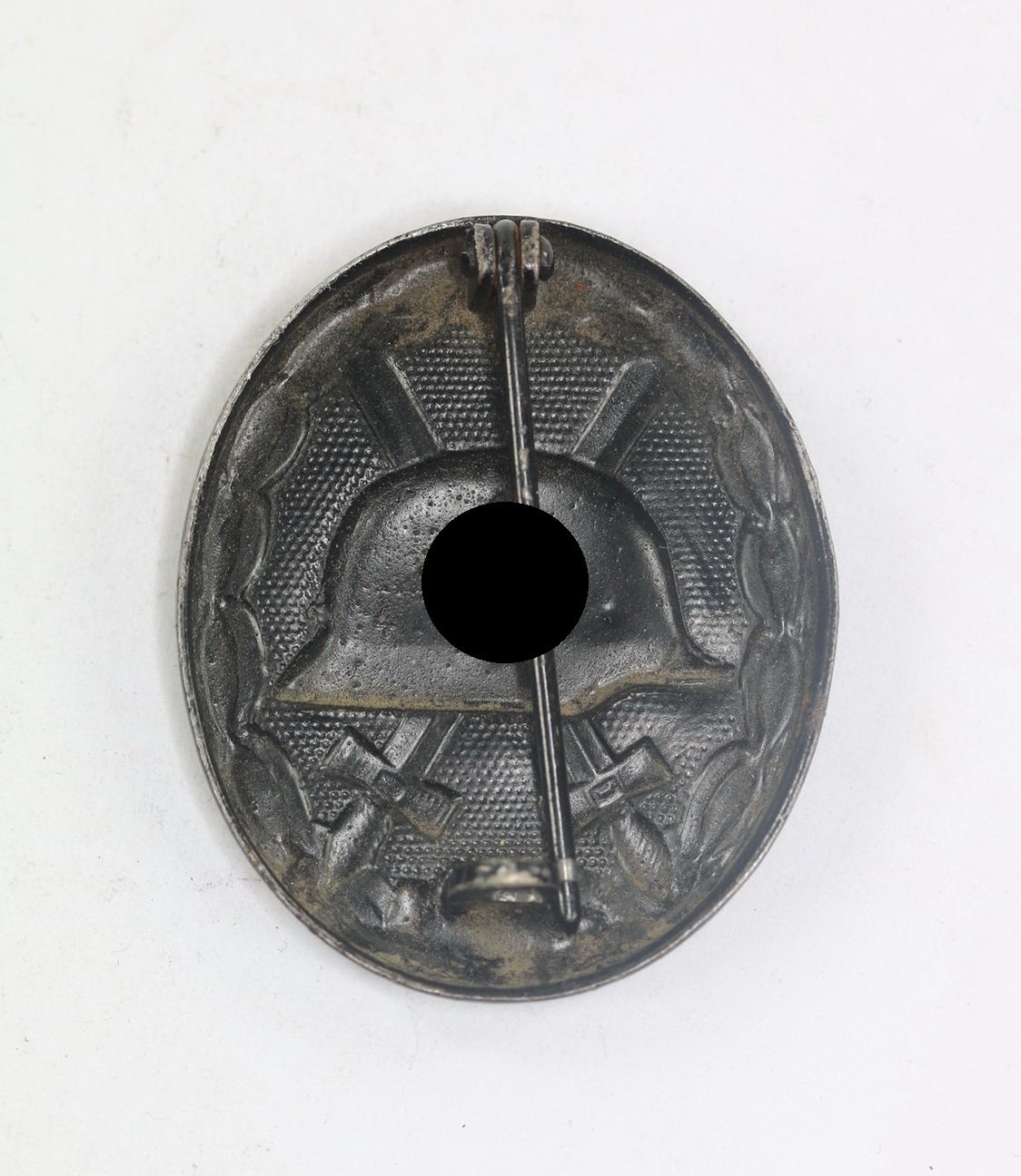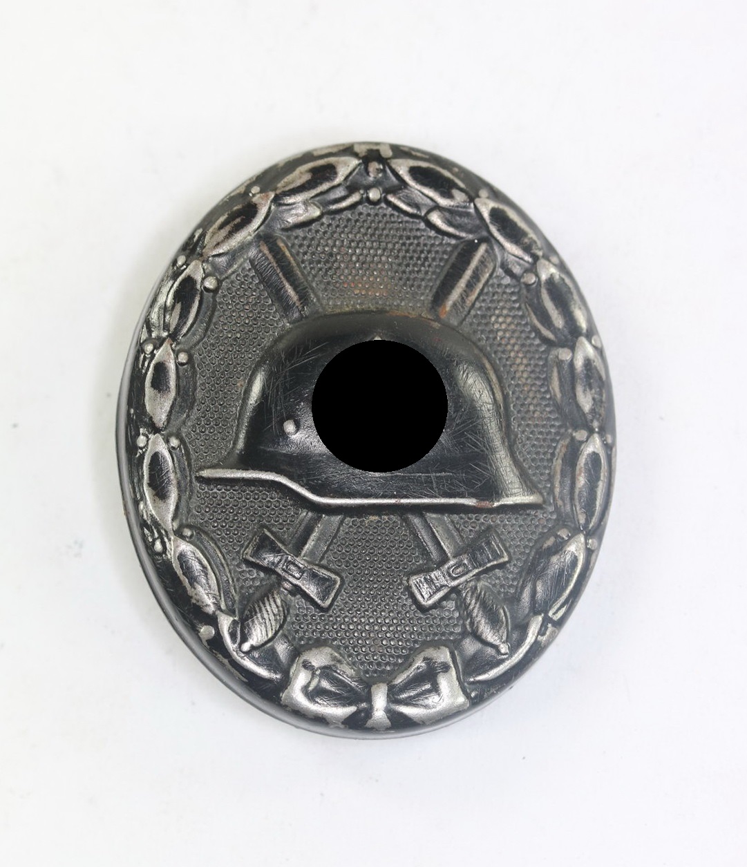 Das Verwundetenabzeichen aus Eisenblech. Sehr guter, leicht getragener Zustand. Mit noch sehr schöner Schwärzung. Rückseitig im Helm die Hersteller markierung „4“ für die Firma Steinhauer & Lück aus Lüdenscheid. Mit Haken aus Flachdraht.