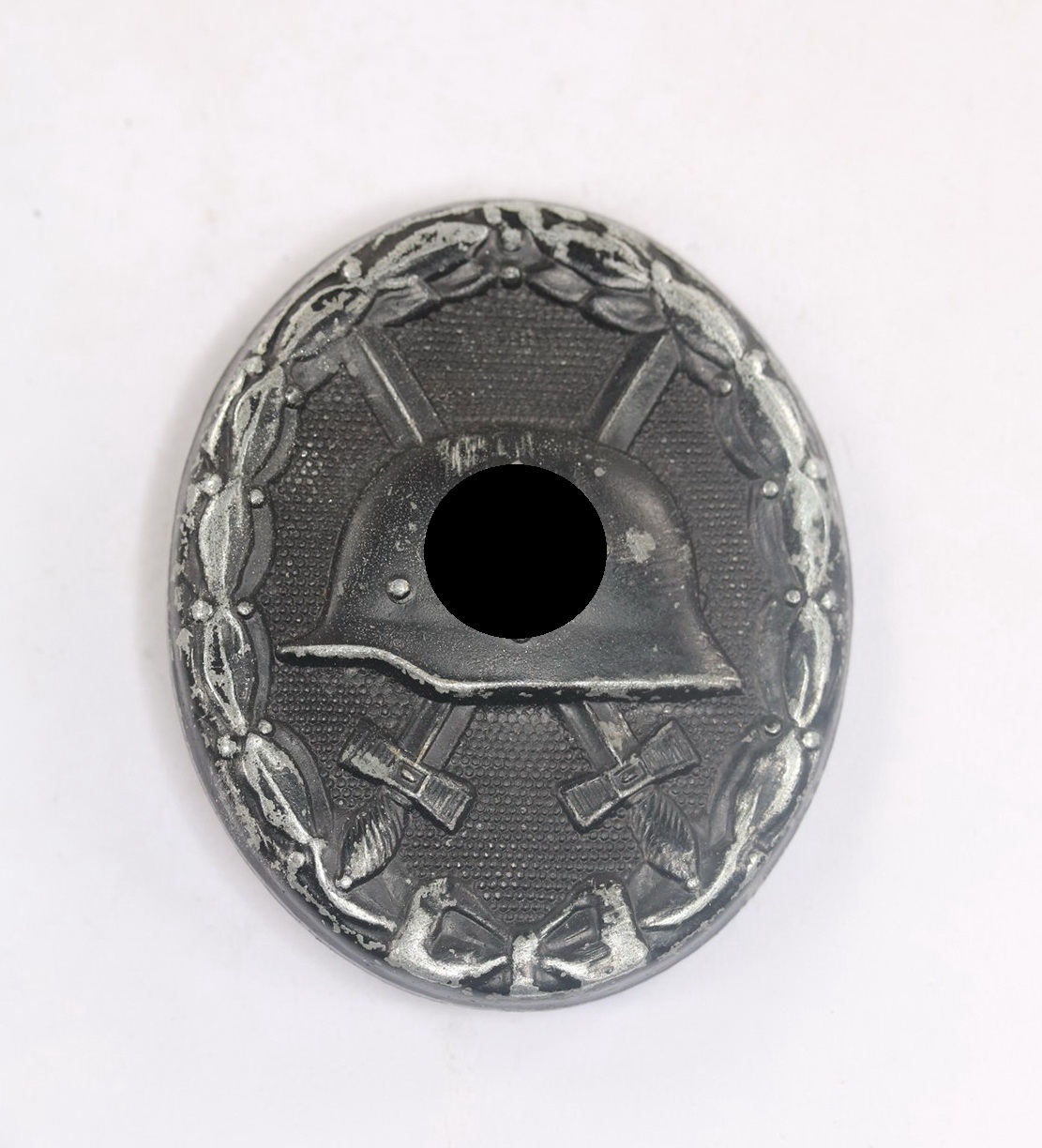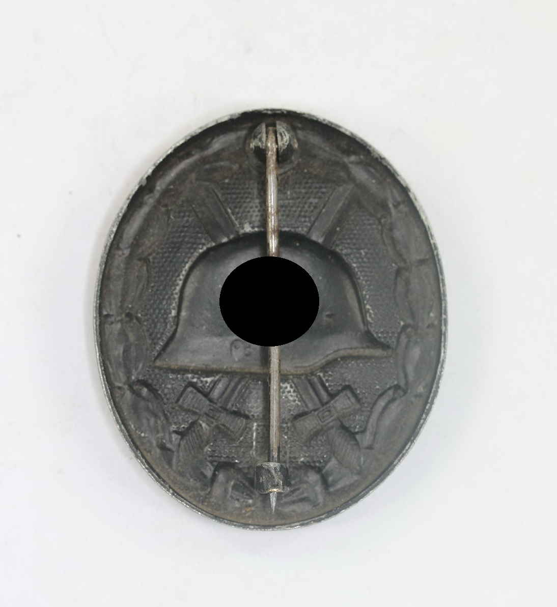 Das Verwundetenabzeichen aus Eisenblech gefertigt. Sehr guter, leicht getragener Zustand. Mit noch schöner Schwärzung. Rückseitig im Helm die Hersteller Markierung „93“ für die Firma Richard Simm & Söhne aus Gablonz (R.S.S.). Mit typischem Nadelsystem.