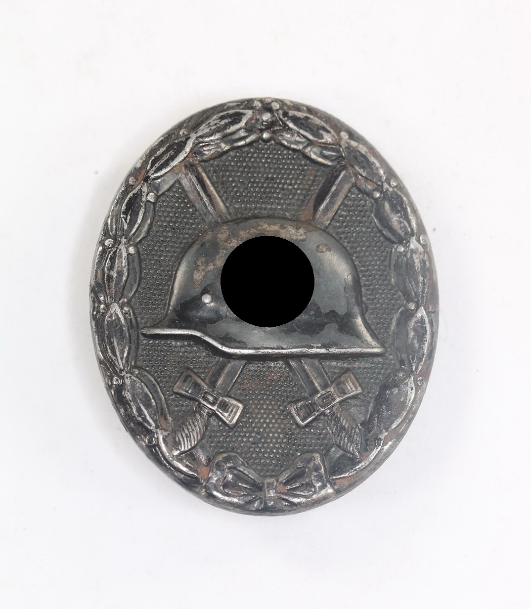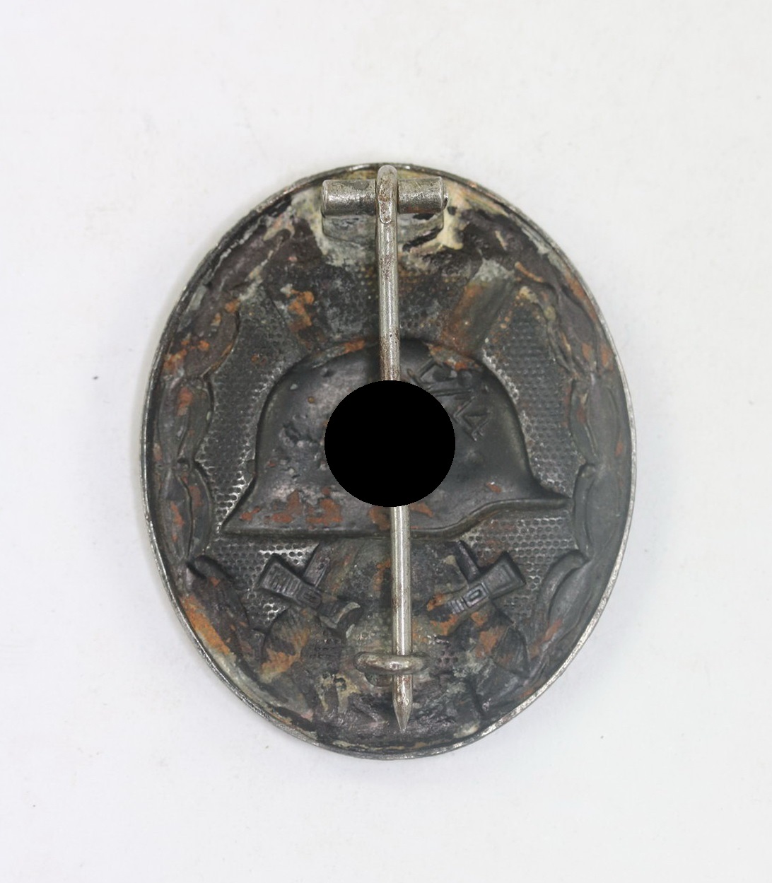 Das Verwundetenabzeichen aus Eisenblech. Sehr guter, leicht getragener Zustand. Mit noch schöner Schwärzung. Rückseitig im Helm die Hersteller Markierung „L/14“ für die Firma Friedrich Orth aus Wien.