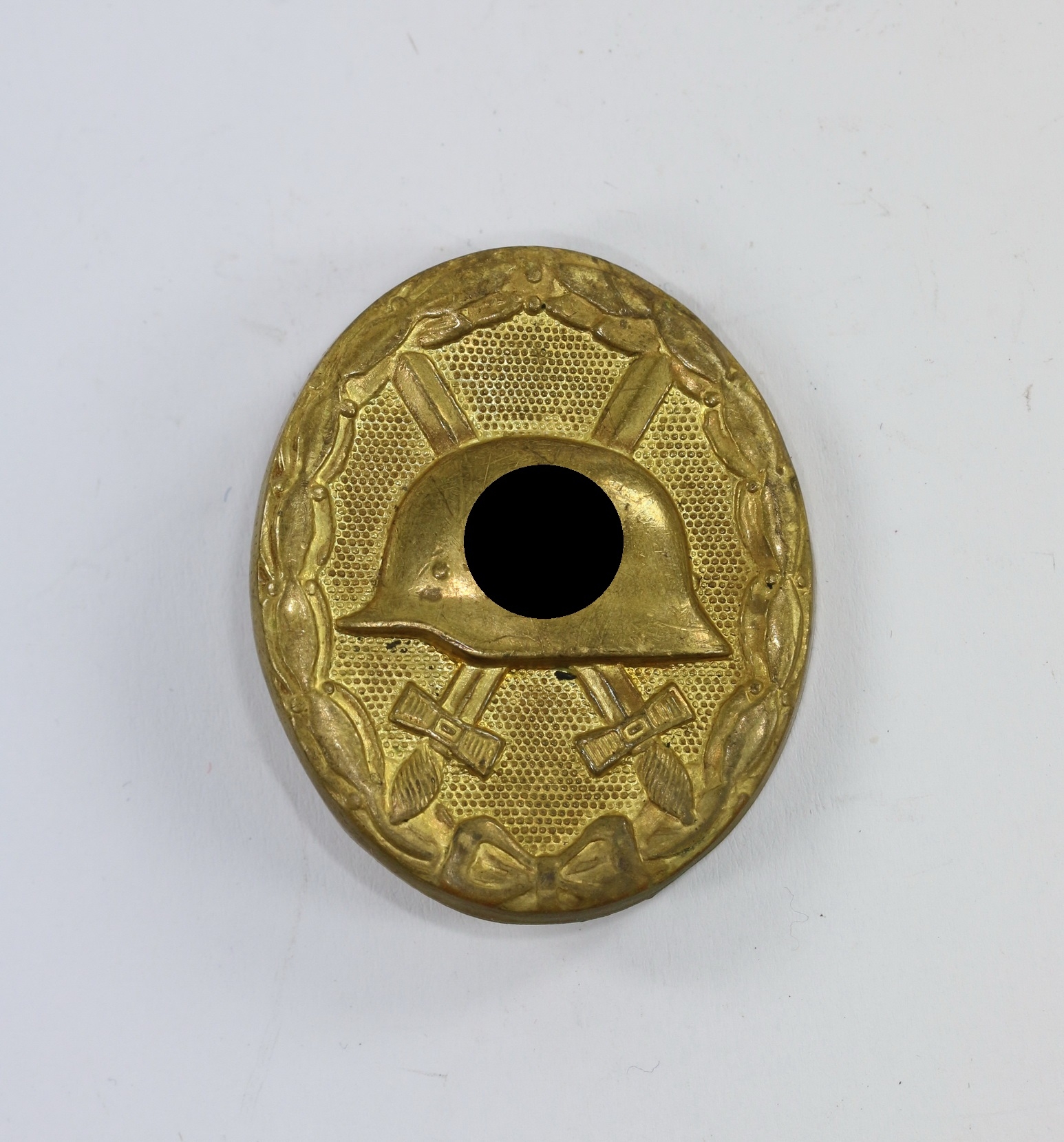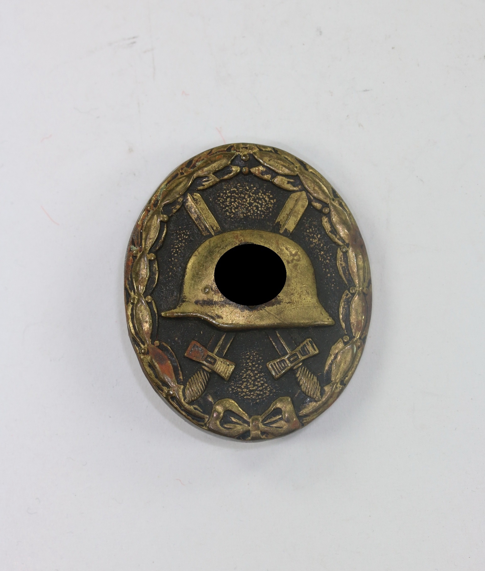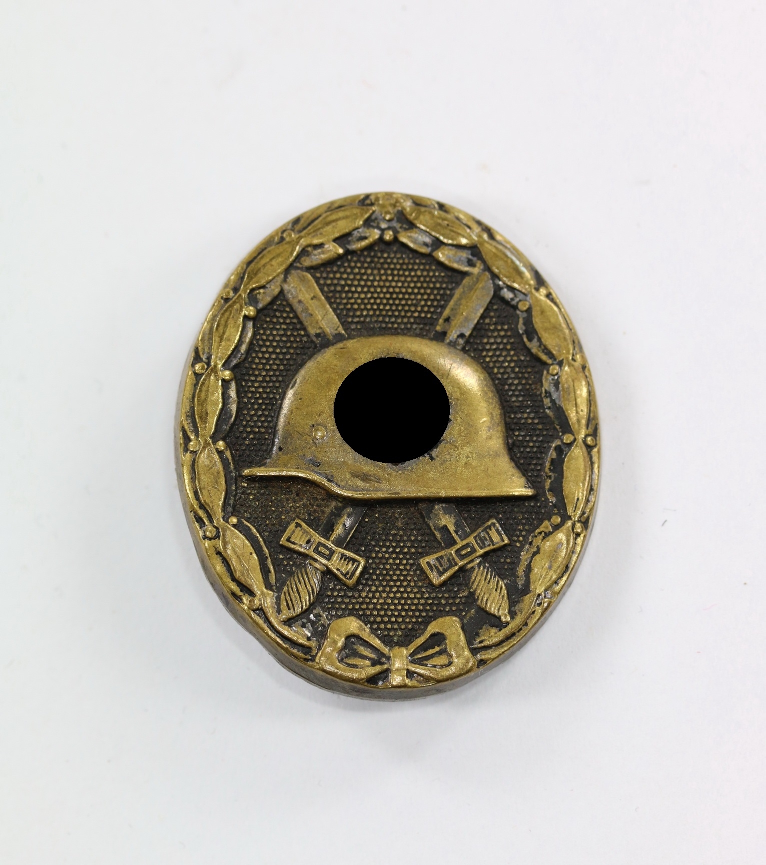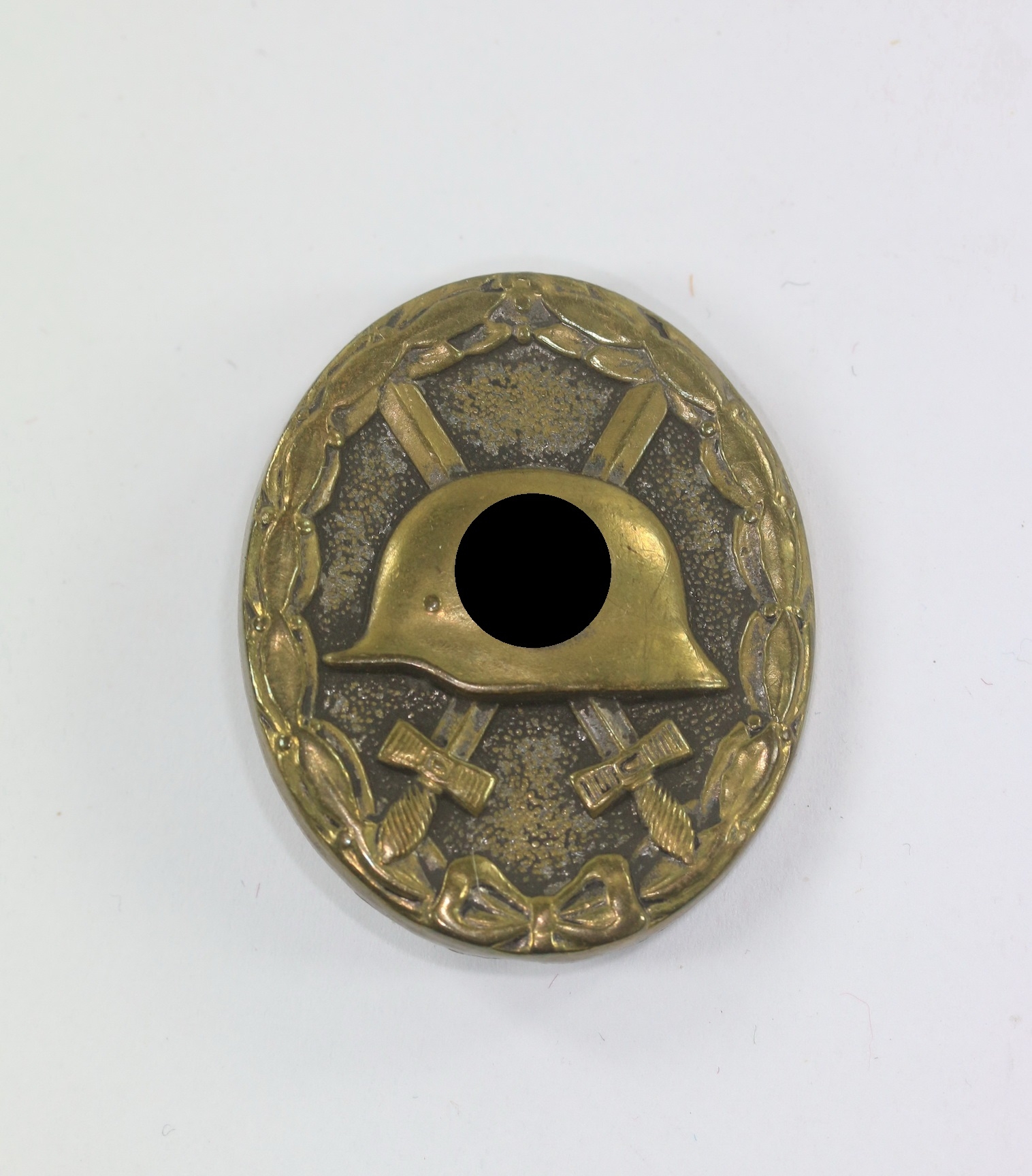 Buntmetall, leicht getragener Zustand. Vom Träger vollständig von der Schwärzung befreit, um es als goldenes tragen zu können. Ohne Hersteller, aber eine bekannte Variante.