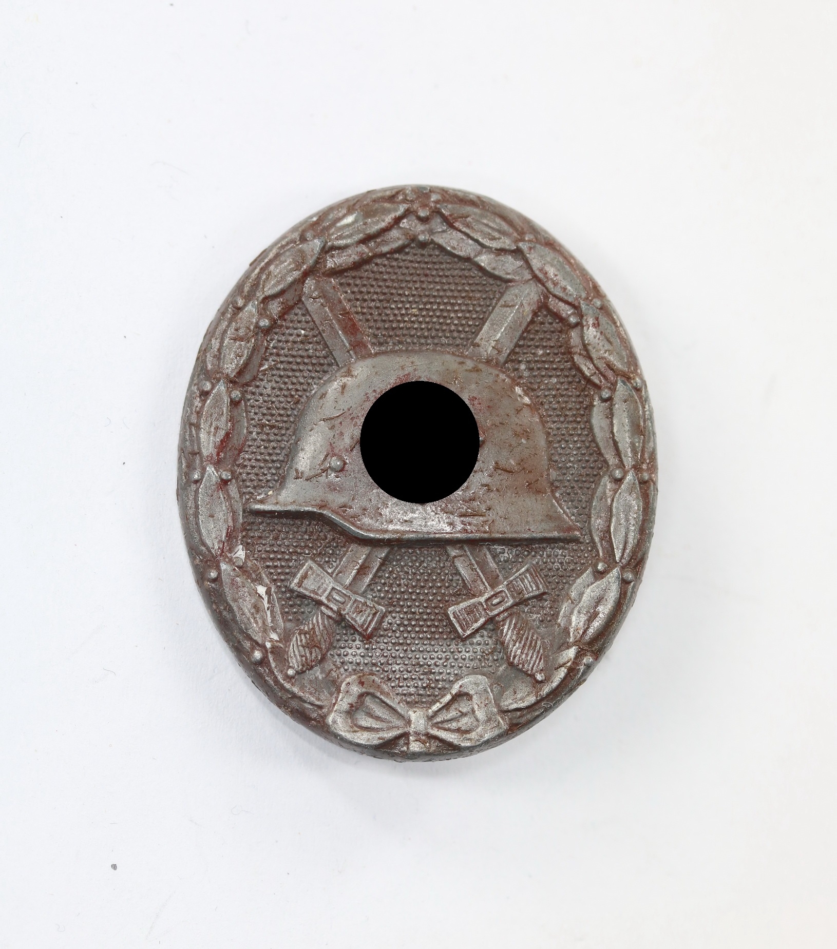 Zink, sehr guter, leicht getragener Zustand. Mit vollständiger Versilberung und unberührter Patina. Ohne Hersteller, aber eine bekannte Variante.