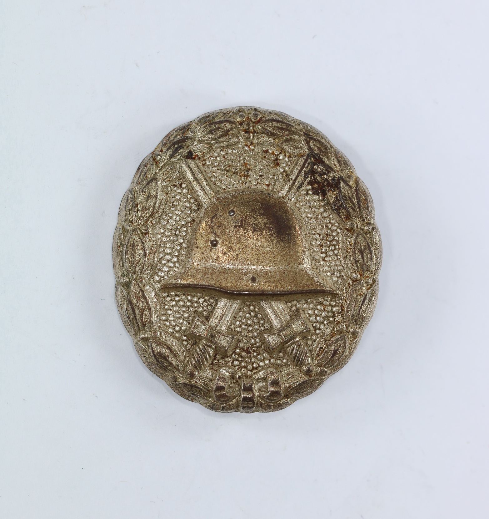 Buntmetall, sehr guter, nur leicht getragener Zustand. Mit vollständiger Versilberung, mit leichter Patina. Im Helm der Hersteller „L/54“ für die Firma Schauerte & Höhfeld, Lüdenscheid.