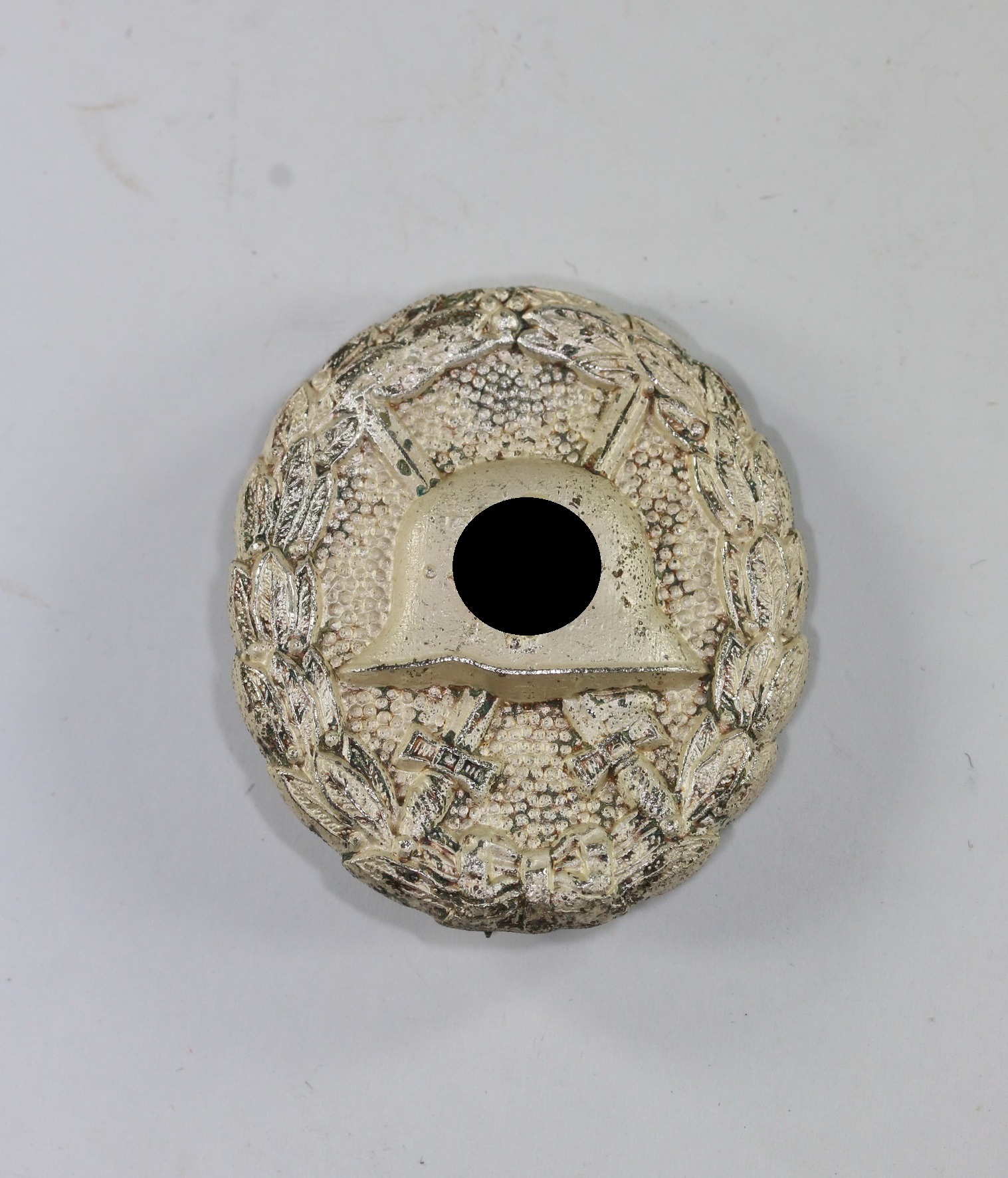 Zink, excellenter, ungetragener Zustand. Mit vollständiger, frostiger Versilberung. Hakenkreuz und kanten poliert. Mit minimalen Ansätzen von Patina. Ohne Hersteller, aber eine bekannte Variante der Firma Gebrüder Wergerhoff, Lüdenscheid (GWL).