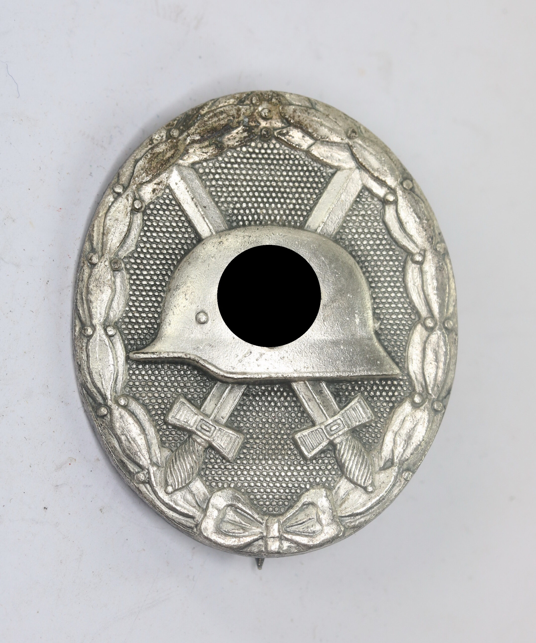 Zink, sehr guterm nur minimal getragener Zustand. Mit vollständiger Versilberung und leichter Patina. Rückseitig, links neben den Nadelhaken die Hersteller Markierung „L/12“ für die Firma C.E. Juncker, Berlin. Mit Variante beim Nadelsystem!