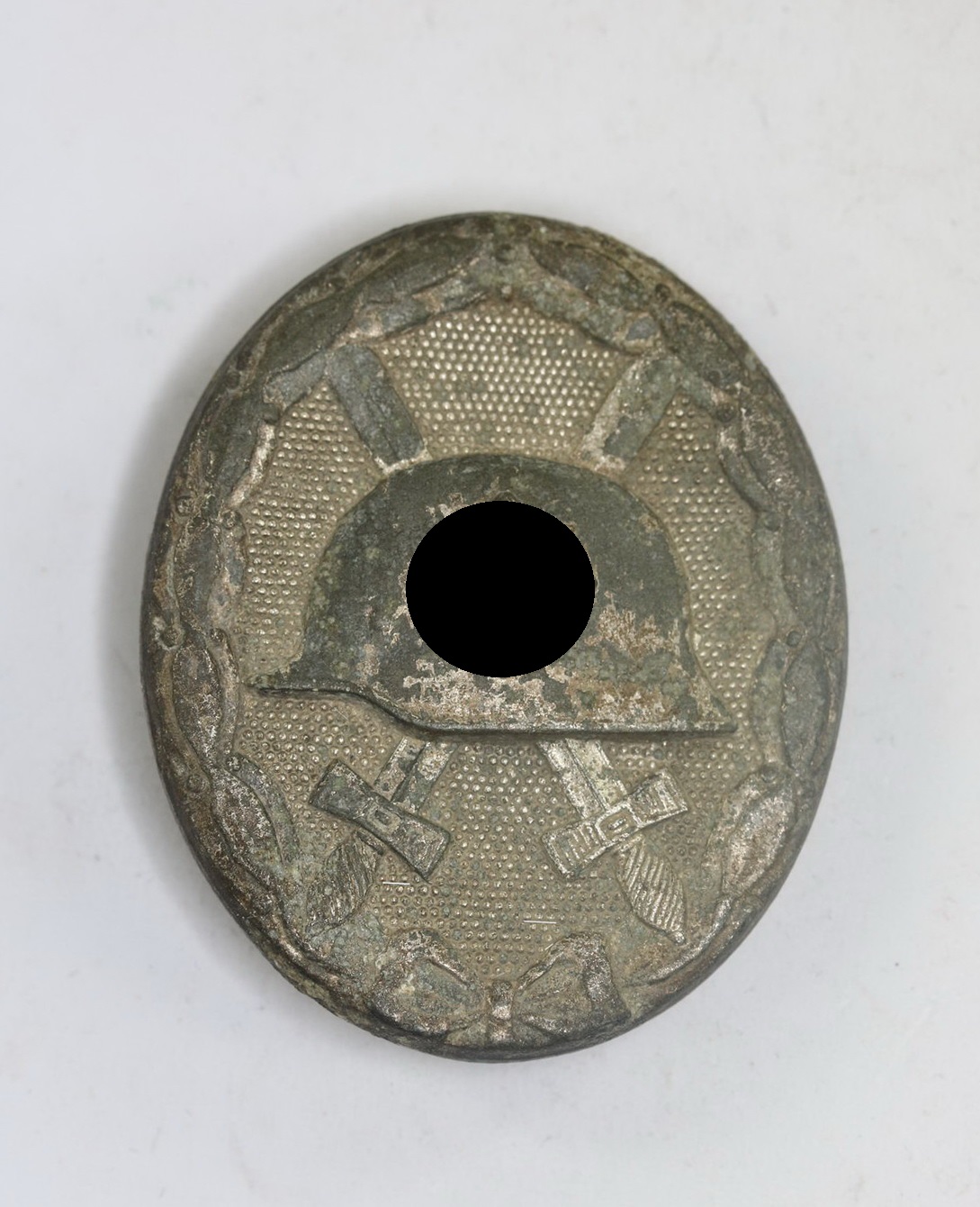 Zink versilbert, sehr guter, leicht getragener Zustand. Ohne Hersteller Markierung, aber eine bekannte Variante.