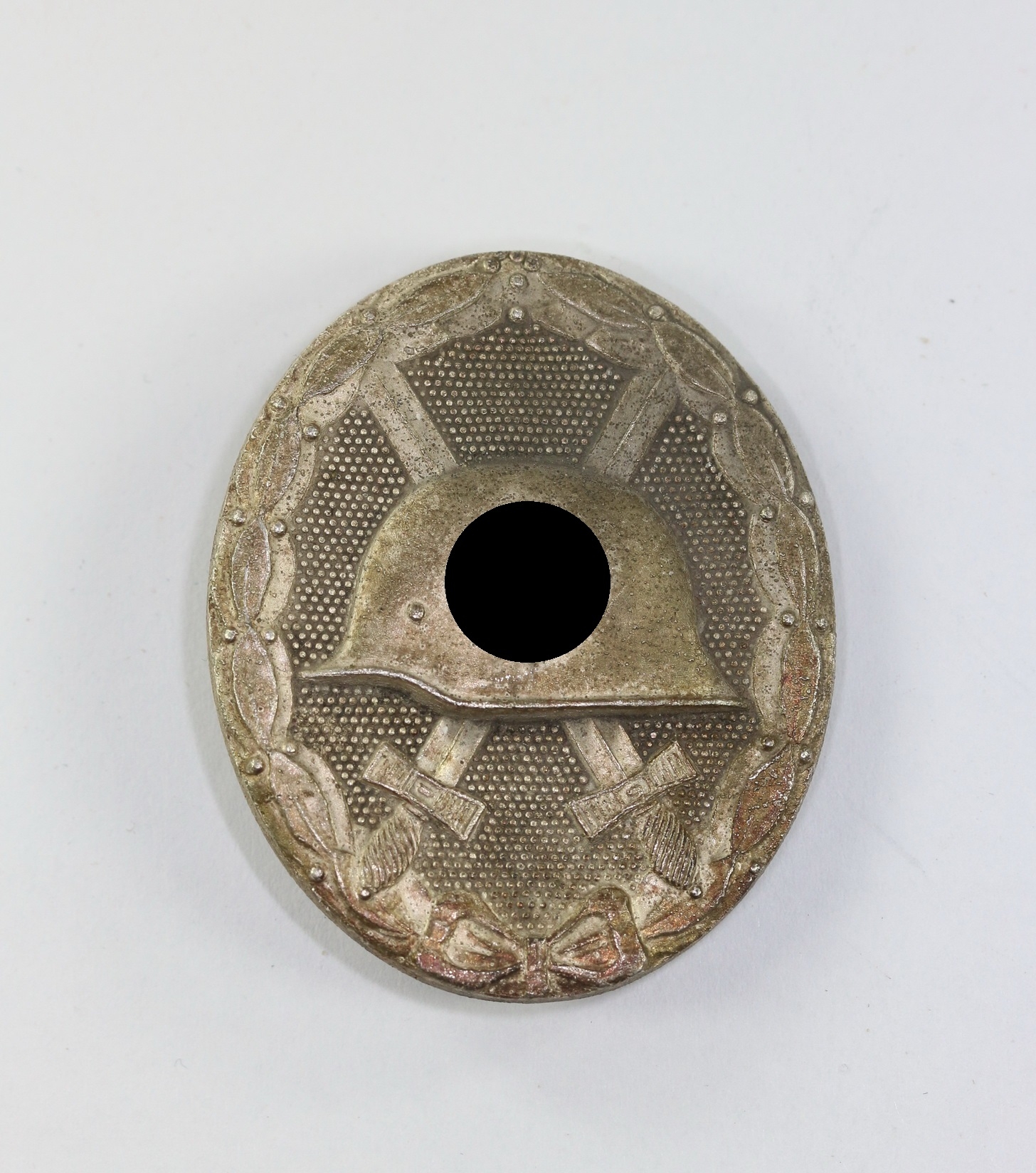 Zink, sehr guter, nahe zu ungetragener Zustand. Mit fast vollständiger Versilberung, mit leichter Patina. Mit Hersteller „L/14“ für die Firma Friedrich Orth, Wien. Siehe GCA Datenbank. In der sehr seltenen varainte mit gekelter Nadel!