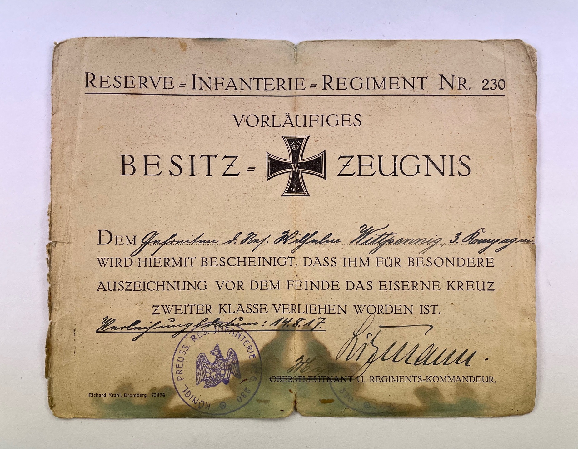 Vorläufiges Besitzzeugnis Eisernes Kreuz 2. Klasse 1914