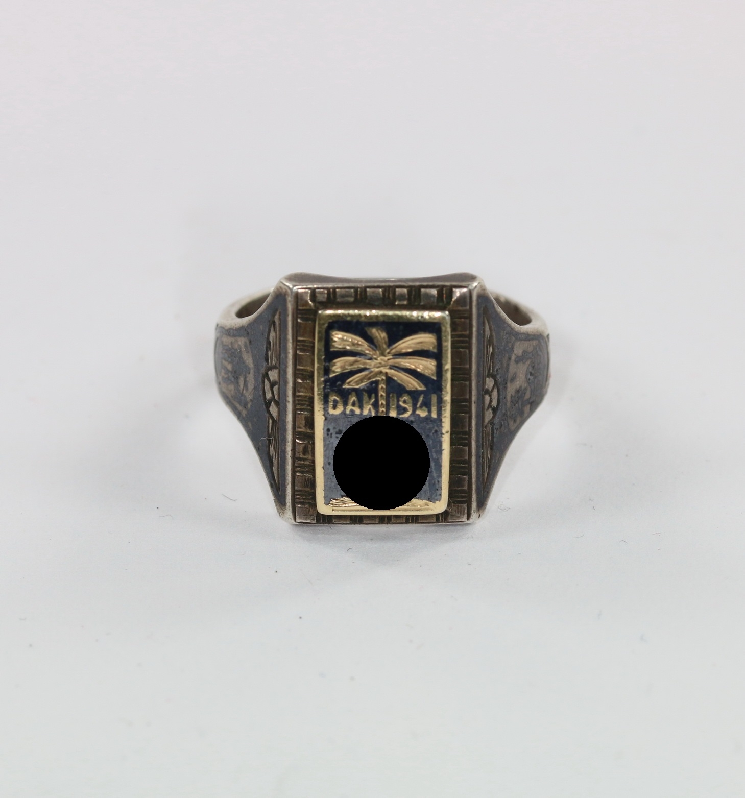 Silber, teilweise vergoldet. Sehr guter, nur leicht getragener Zustand Im Zentrum schöne gravierte Darstellung der Afrika Korps Palme mit Hakenkreuz und „DAK – 1941“, für Deutsches Afrika Korps. Seitlich typische Motive, Kamel mit Reiter und Mosche. Innendurchmesser ca. 23 mm.