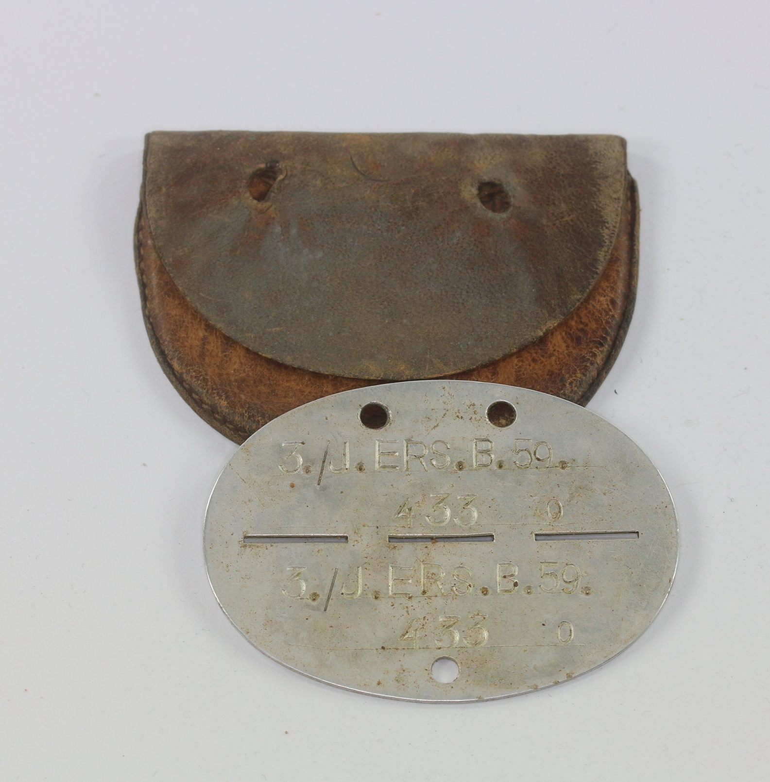Aluminium, sehr guter, leicht getragener Zustand. „3./J.ERS. B. 59.“ für 3. Kompanie Infanterie-Ersatz-Bataillon 59. In zugehöriger Lederhülle.