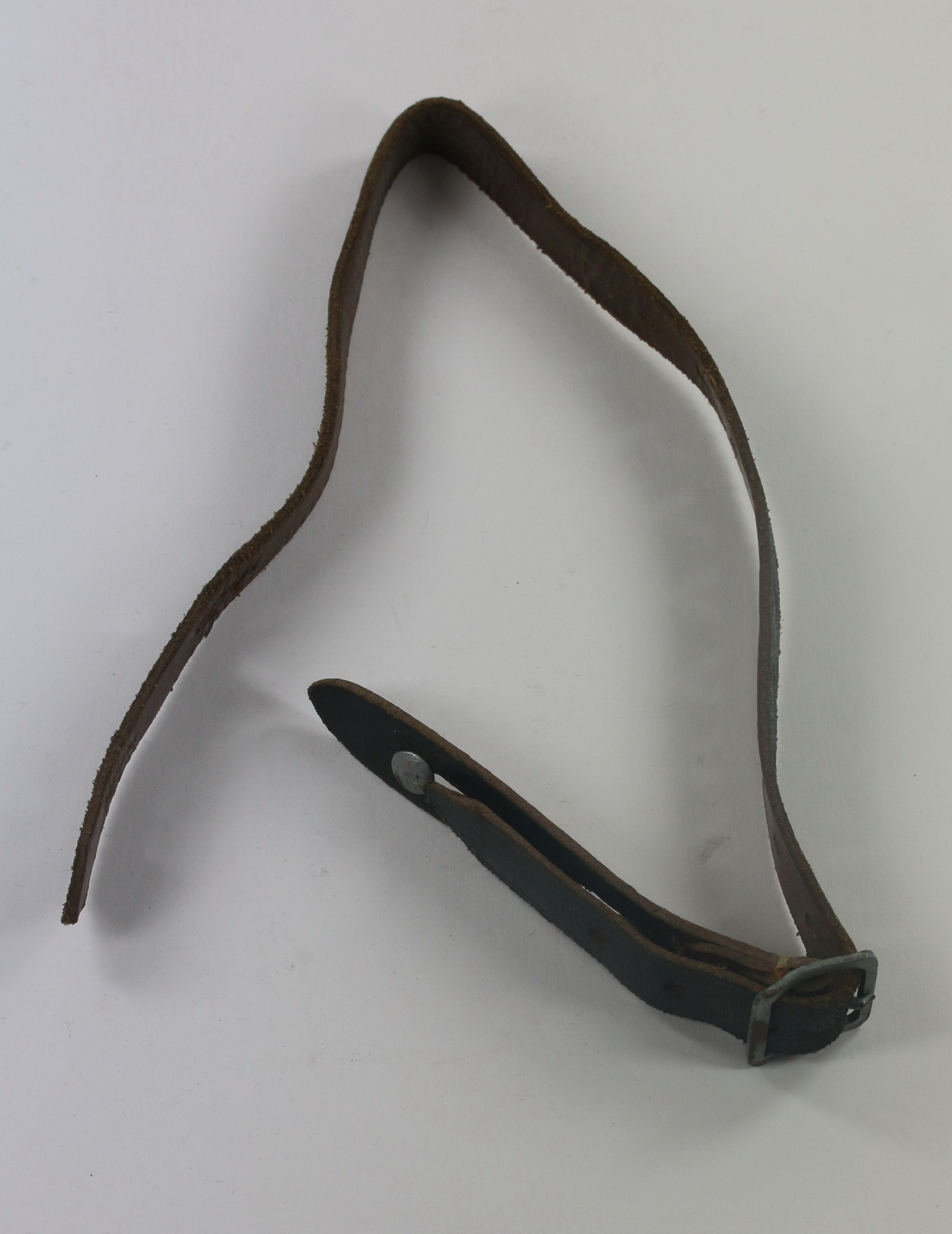 Leder, volle Länge. Sehr guter, ungetragener Zustand. Mit Schnalle und einer Niete aus Eisen, die andere niete leider aus Stahl. Der Hersteller Stempel nur noch teilweise zu leden „RB Nr ……..“.
