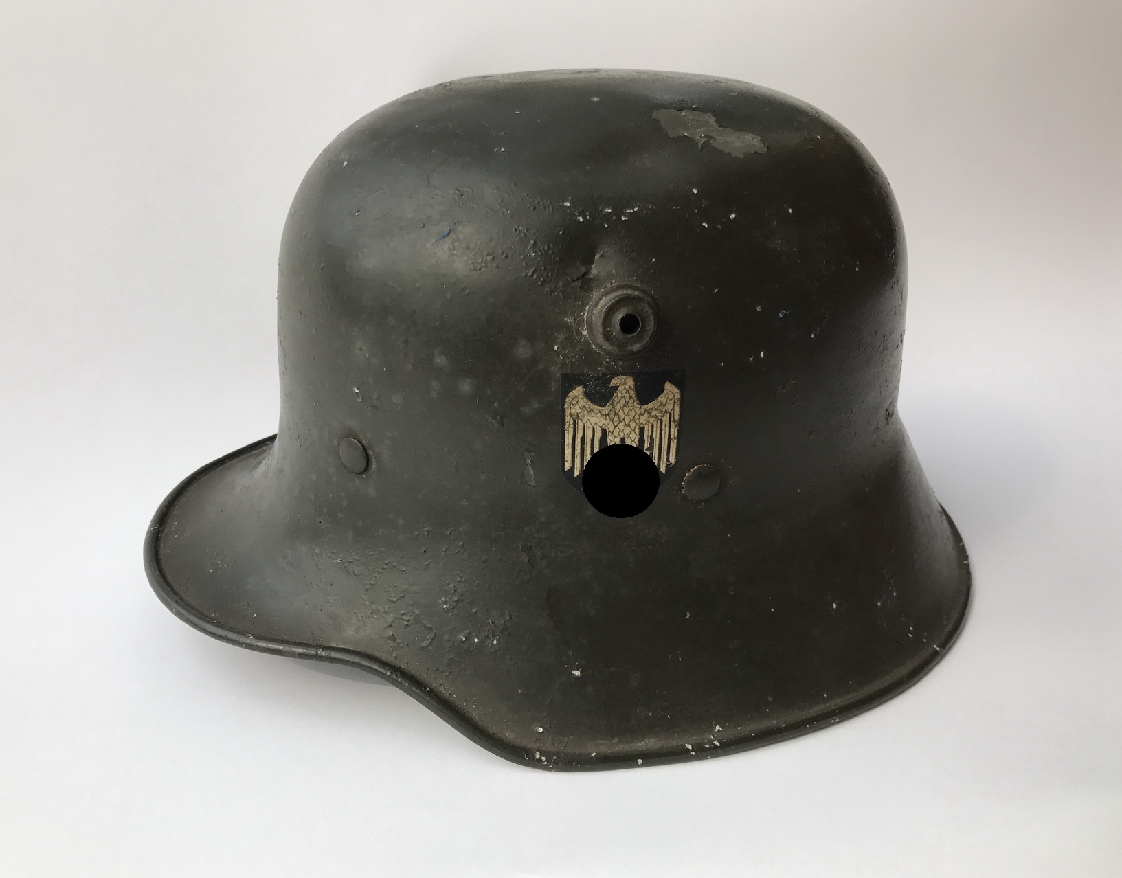 Sehr guter, nur leicht getragener Zustand. Zwei kleine Beulen, sonst ca. 95% originaler grüner Lack. Mit beiden Emblemen, der Adler zu ca. 95% vorhanden, der Wappenschild zu ca. 90%.