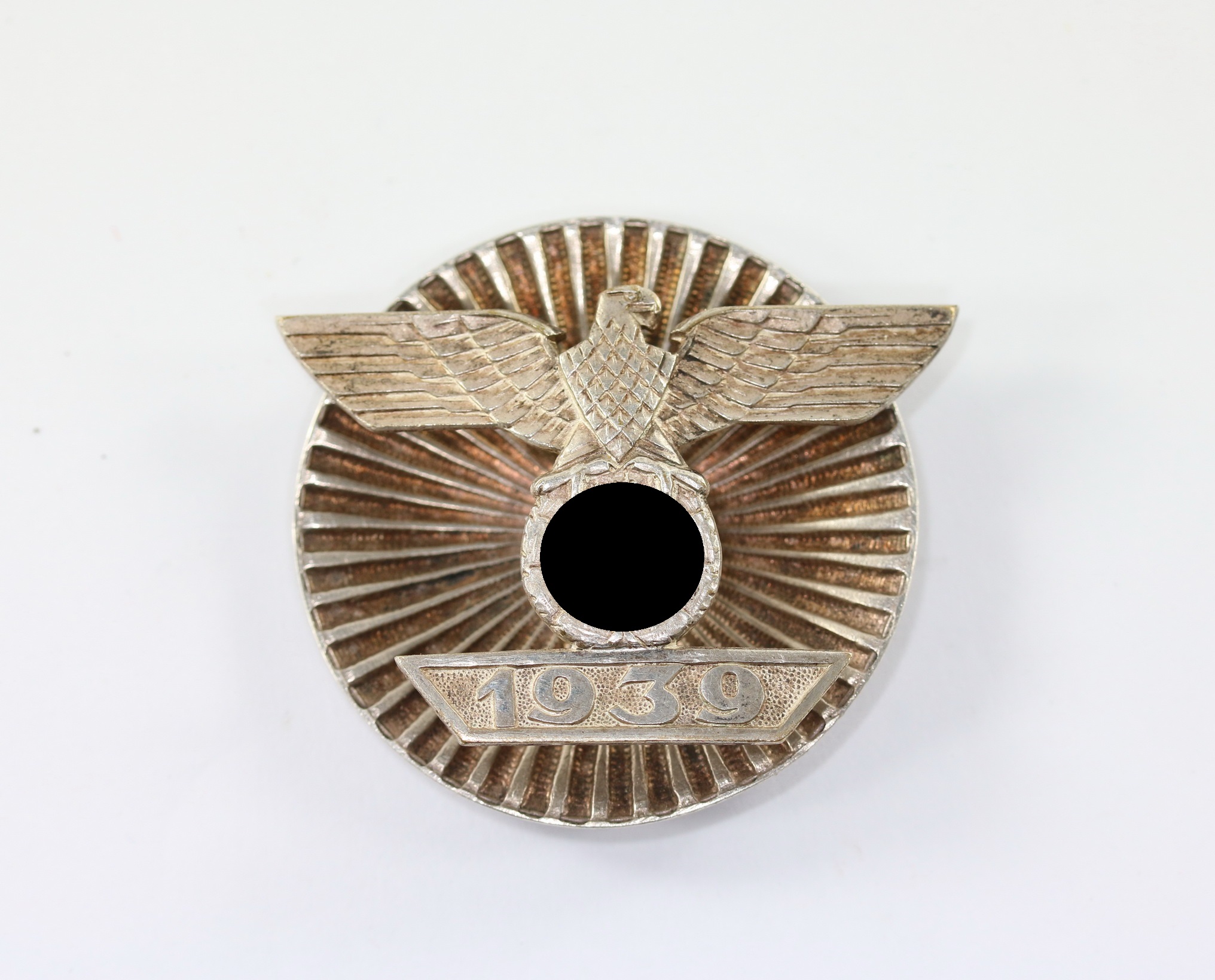 Buntmetall, sehr guter, nur minimal getragener Zustand. Mit vollständiger Versilberung und leichter Patina. Ohne Hersteller, aber eine bekannte Variante der Firma Wilhelm Deumer, Lüdenscheid. Sie GCA-Datenbank. An großer Sternscheibe.