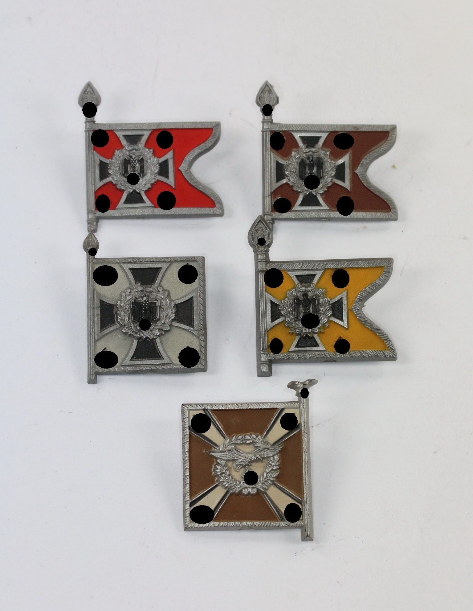 Aus der Serie Fahnen und Standarten der Deutschen Wehrmacht, fünf verschiedene Abzeichen, alle in einen sehr guten Einwandfreien Zustand.