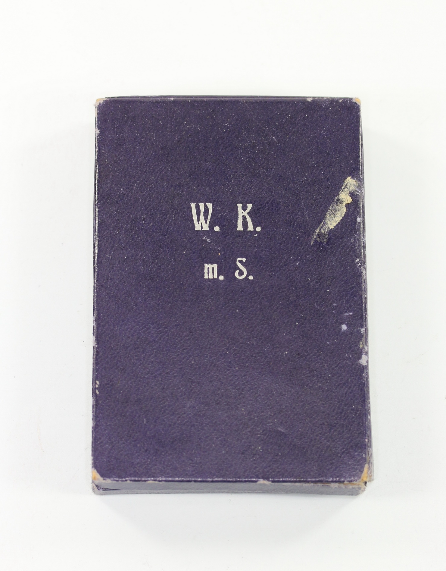 Der Deckel vom Unterteil getrennt, sonst sehr guter, leicht gebrauchter Zustand. Im Deckel das Etikett „K.Münzamt Abt.Orden Stutgart“.