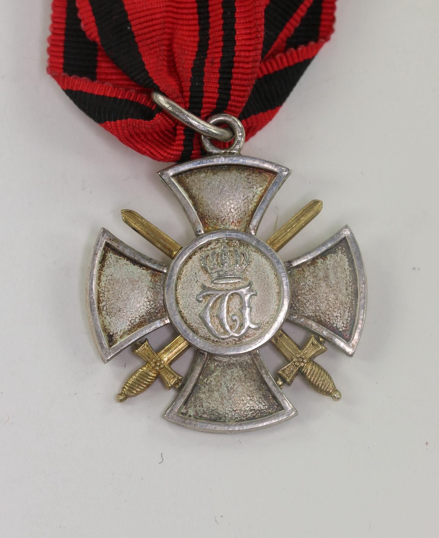 Silber, die Schwerter vergoldet, sehr guter, nur mi imal getragener Zustand.