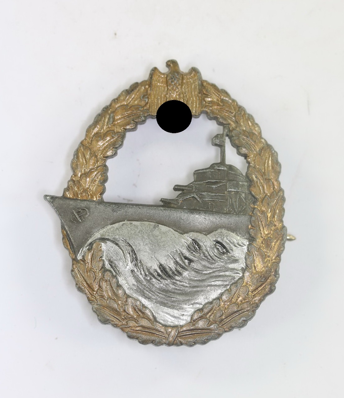 Zink, sehr guter, nur leicht getragener Zustand. Rückseitig die Hersteller Markierung „S.H.u.Co.“ für die Firma Sohni Heubach & Co. aus Oberstein. Siehe Weber/Skora, Die Kriegsabzeichen der Kriegsmarine.