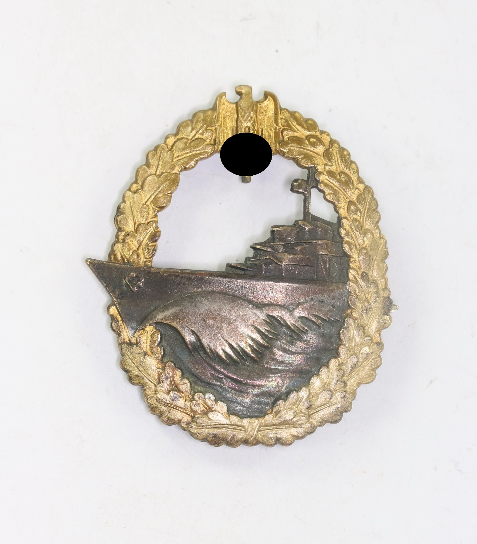 Buntmetall, sehr guter, nur minimal getragener Zustand. Mit fast vollständiger Vergoldung. Das Schiff mit vollständiger Tönung. Hakenkreuz und Kanten poliert. Mit leichter Patina. Mit Hersteller „Schwerin Berlin 68“. Siehe GCA-Datenbank.
