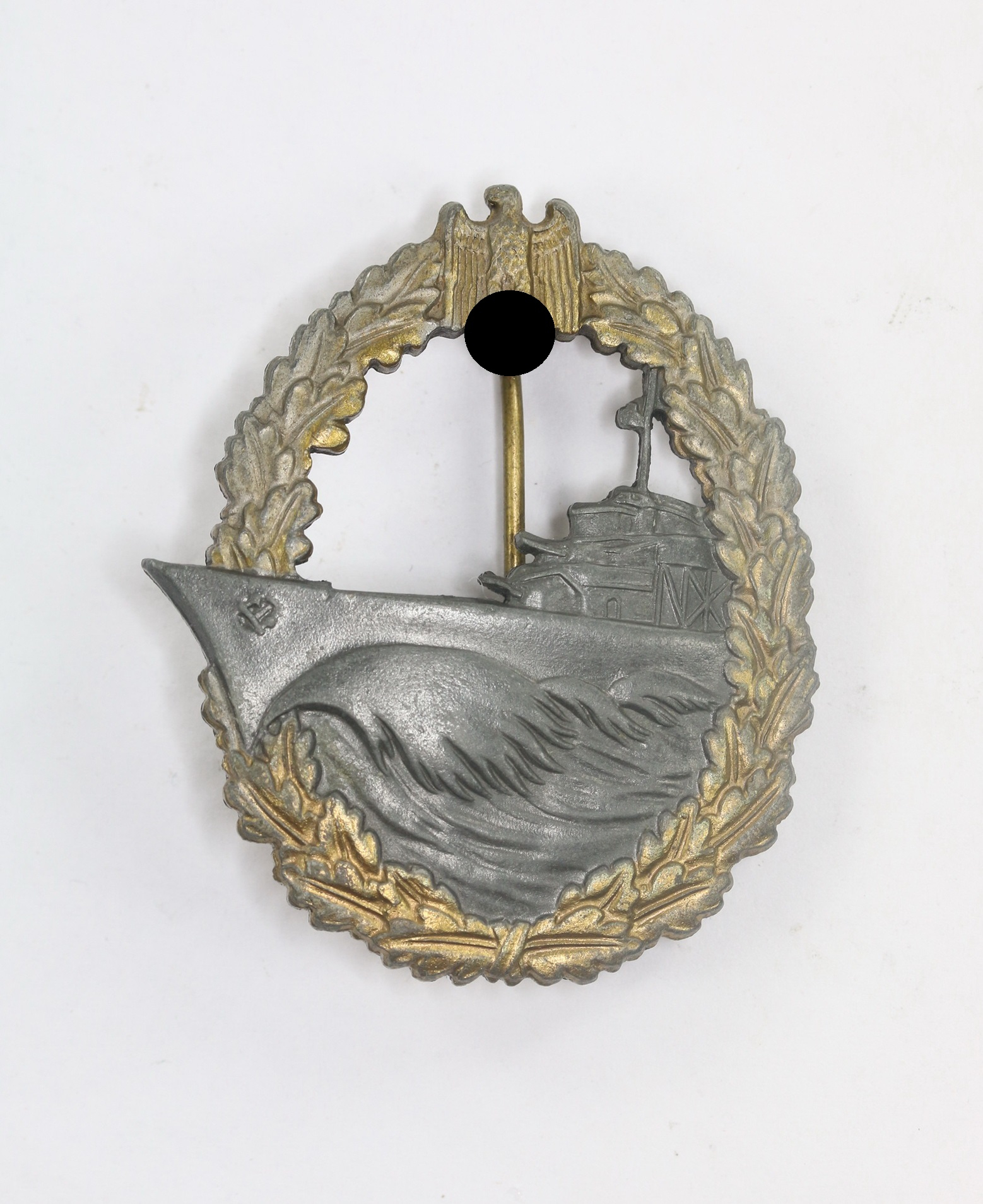 Zink, sehr guter, minimal getragener Zustand. Das Schiff mit vollständiger Tönung, der Kranz mit vollständiger Vergoldung. Mit leichter Patina. Mit Hersteller „W.H.“ für die Firma Wilhelm Hobacher, Siehe GCA-Datenbank.