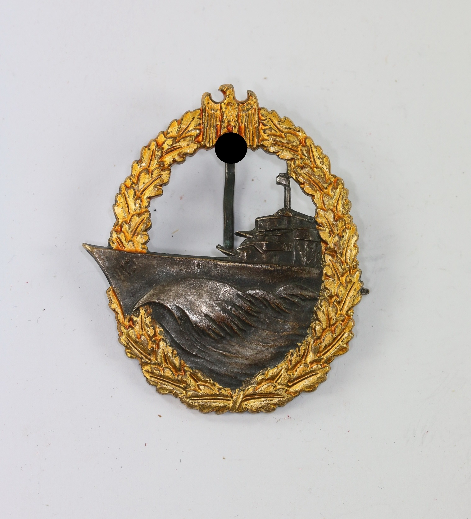 Buntmetall, sehr guter, nur minimal getragener Zustand. Der Kranz mit vollständiger, strahlender Vergoldung, Schiff und Wasser mit vollständiger Tönung. Auf der Nadel der Hersteller „4“ für die Firma Steinhauer & Lück, Lüdenscheid. Siehe Weber/Skora, Die Kriegsabzeichen der Kriegsmarine.