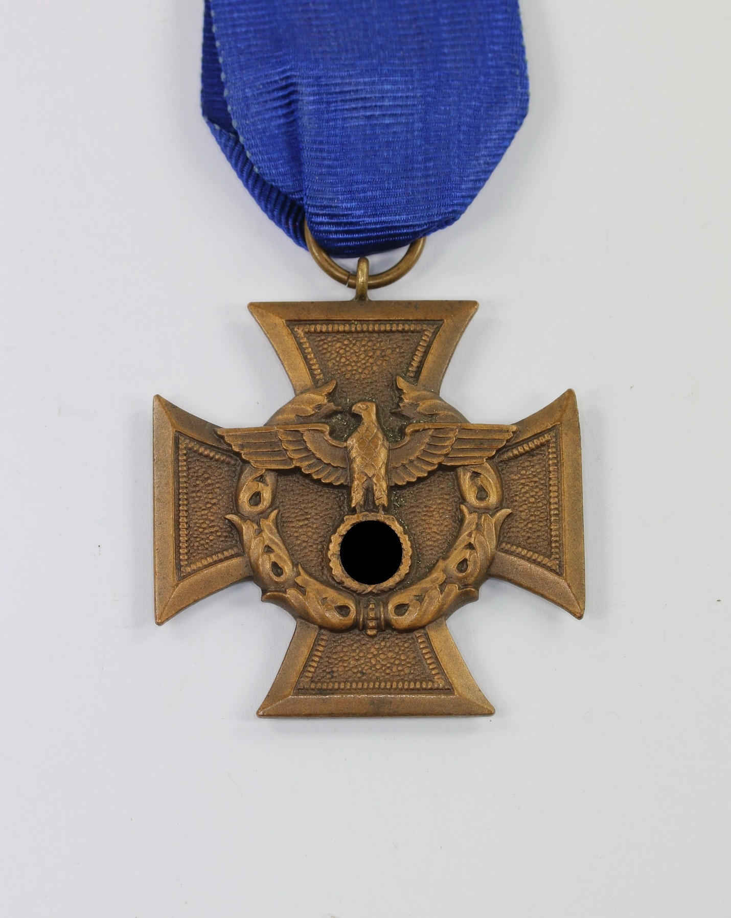 Buntmetall bronziert, excellenter, ungetragener Zustand. Mit vollständiger Bronzierung. Ohne Hersteller, aber eine bekannte Variante. Rückseitig „Für Treue Dienste im Zollgrenzschutz“. Mit blauen Band, ohne gestickten Adler(!).