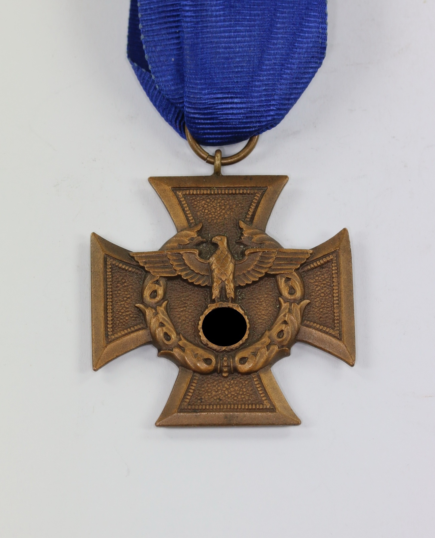 Buntmetall bronziert, excellenter, ungetragener Zustand. Mit vollständiger Bronzierung. Ohne Hersteller, aber eine bekannte Variante. Rückseitig „Für Treue Dienste im Zollgrenzschutz“. Mit blauen band, ohne gestickten Adler(!).